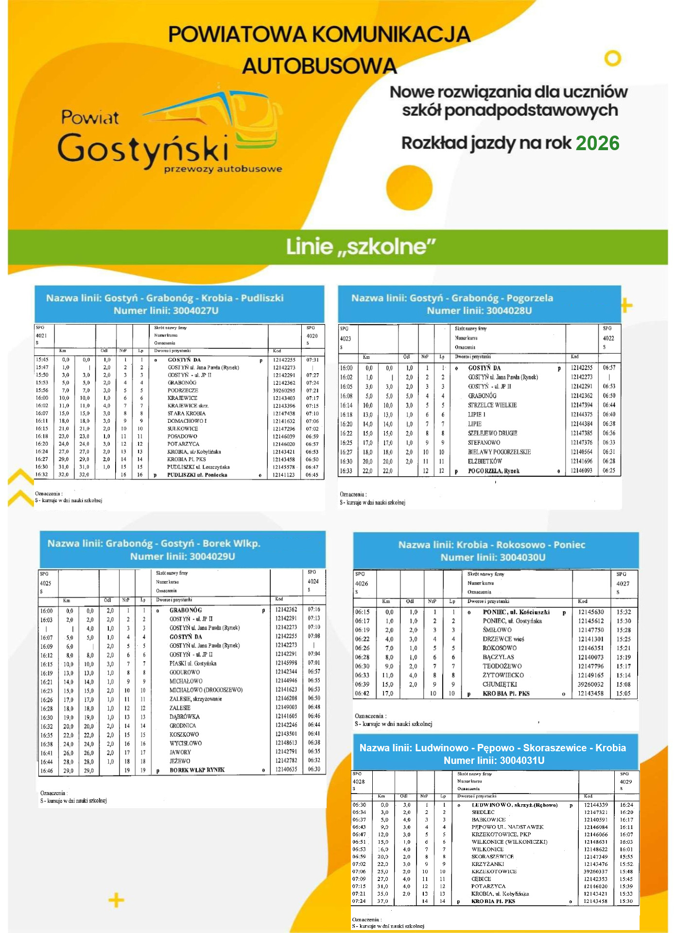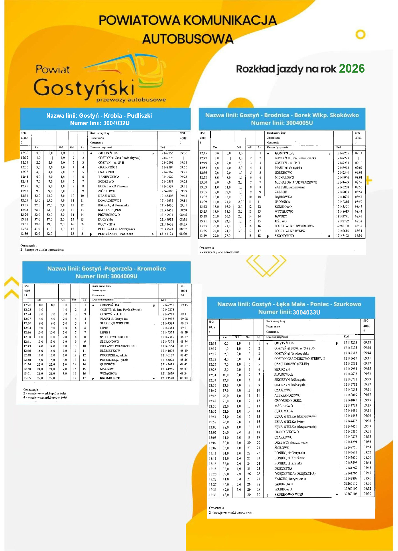 - Linia nr 3004005U GOSTYŃ - GRODNICA - BOREK WIELKOPOLSKI – SKOKÓWKO kursować będzie jeden dzień w tygodniu tj. w piątki oprócz świąt.